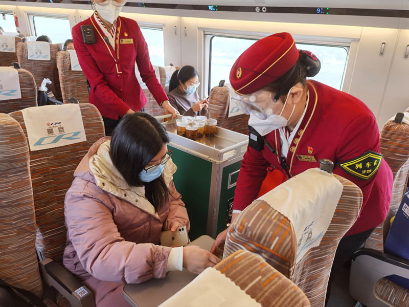 列車到達(dá)石家莊站,列車長(zhǎng)劉晶組織乘務(wù)員立崗迎候,在車門口及時(shí)引導(dǎo)檢測(cè)隊(duì)員就座,車內(nèi)的乘務(wù)員協(xié)助檢測(cè)隊(duì)員妥善安置行李。開(kāi)車后,乘務(wù)員細(xì)心為他們送上消毒濕巾和熱茶,同時(shí)詢問(wèn)乘車需求。列車到達(dá)天津西站,列車長(zhǎng)攜全體乘務(wù)員行注目禮送醫(yī)療隊(duì)下車,短暫的旅程結(jié)束,檢測(cè)隊(duì)成員們順利返津。