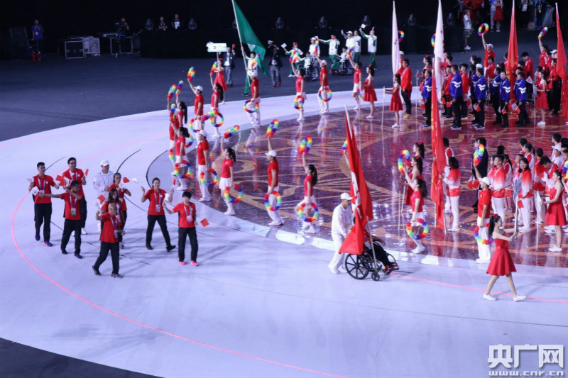 開幕式于當(dāng)晚20時正式開始。在護(hù)旗手的護(hù)衛(wèi)下,中華人民共和國國旗、殘運會會旗、特奧會會旗分別入場。隨后裁判員代表方隊和35個代表團(tuán)的殘疾人運動員代表依次入場。