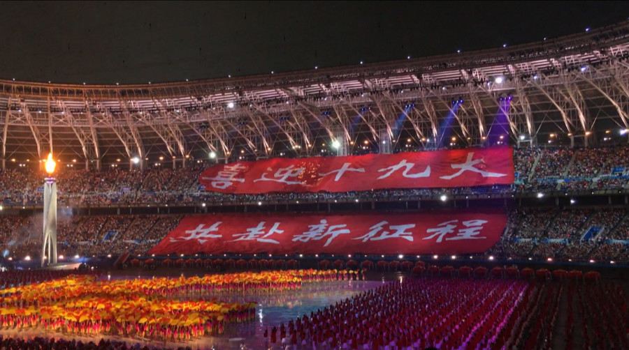 觀眾席上出現(xiàn)“喜迎十九大,共赴新征程”的標(biāo)語