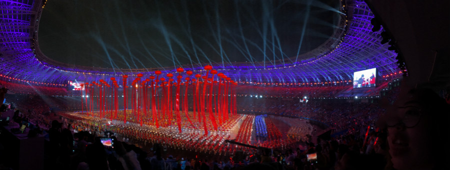據(jù)了解,開幕式儀式及文體展演演員共6555名。除了少數(shù)專業(yè)文藝工作者和體育工作者,絕大部分是平時活躍在健身廣場的市民和普通的大中小學(xué)生,年齡最大的76歲,年齡最小的6歲。展演排練時間僅有兩個月,創(chuàng)國內(nèi)大型體育活動開幕式排練時間最短記錄。