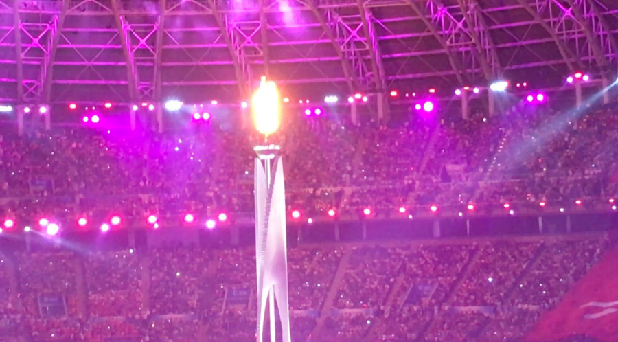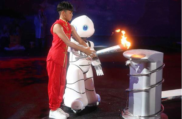 在火炬?zhèn)鬟f環(huán)節(jié),首創(chuàng)將場內(nèi)火炬?zhèn)鬟f延伸進(jìn)觀眾席,火炬所到之處,激發(fā)觀眾手中紅色發(fā)光物燃亮,以“火光帶動燈光”在視覺上形成燈火相映、光芒燃動的震撼效應(yīng)。這是一次獨(dú)特的看臺景觀設(shè)計(jì),造就了一次參與人數(shù)眾多的火炬?zhèn)鬟f,也體現(xiàn)了“全運(yùn)惠民,健康中國”的主題,采取津娃與智能機(jī)器人攜手點(diǎn)燃圣火的方式,這是傳統(tǒng)與現(xiàn)代的碰撞、是文化與科技的交握,寓意天津?qū)ξ磥淼难s——以體育的名義,誠邀天下;以圣火的光芒,啟動未來。