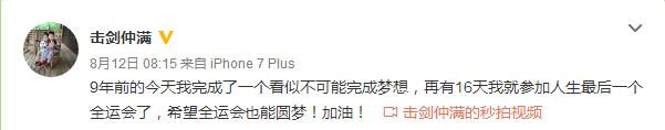 8月12日,仲滿在個(gè)人微博上寫(xiě)道:“9年前的今天我完成了一個(gè)看似不可能完成夢(mèng)想,再有16天我就參加人生最后一個(gè)全運(yùn)會(huì)了,希望全運(yùn)會(huì)也能圓夢(mèng)!加油!”時(shí)隔四年重回賽場(chǎng),仲滿為的就是那枚始終未得的全運(yùn)個(gè)人金牌。