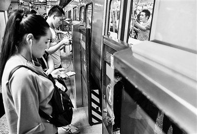 北青報(bào)記者在半個小時的時間內(nèi)觀察,乘客都在屏蔽門前較為有序地候車,沒有發(fā)生搶上搶下行為。