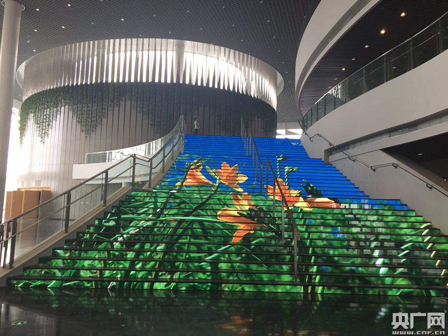 除了穹幕影院,演藝中心的設(shè)計也結(jié)合了諸多高科技元素!笆弧敝笫忻褡呷肫渲,會看到一個“發(fā)光樓梯”,這是演藝中心的一大特色。該樓梯為LED顯示屏樓梯,3部分共37級臺階,可分別顯示圖像也可合成一個屏幕播放,既可以顯示各種文字、圖片、視頻,也可以與現(xiàn)場攝像機無縫聯(lián)接,實況直播,效果令人耳目一新。