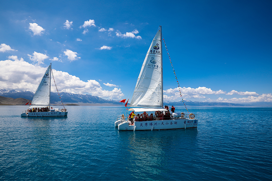 沿途高山蜿蜒盤旋,草色青翠,賽里木湖清新通透,別有一番風(fēng)味。在經(jīng)歷了最難的“皇后賽段”之后,車手們終于揭開賽里木湖神秘的面紗,做最后的沖刺。
