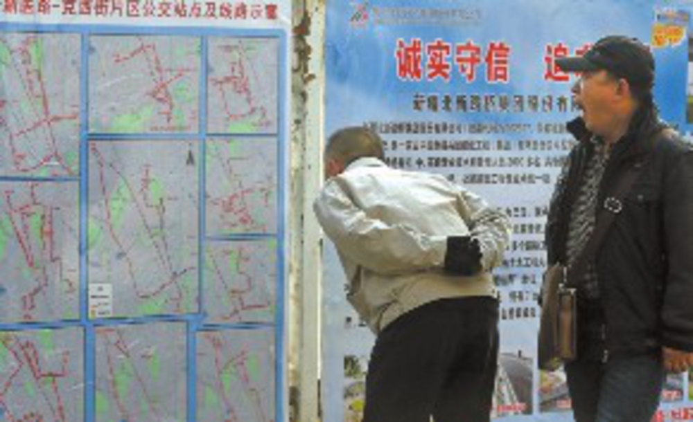 7日10時01分,在西北路,一名行人在查看公交線路示意圖。