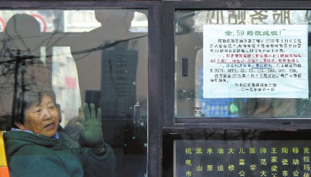 7日9時27分,在阿勒泰路、新醫(yī)路交會路口,一位老人乘上臨時改線的59路公交車后,向家人揮手。