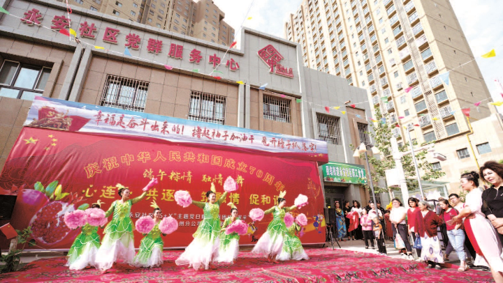 6月3日,在新疆巴音郭楞蒙古自治州庫爾勒市團(tuán)結(jié)街道永安社區(qū),天山雪蓮藝術(shù)團(tuán)演員在表演舞蹈《共筑中國夢(mèng)》。當(dāng)日,該社區(qū)聯(lián)合中國電信巴州分公司開展“心連心、共逐夢(mèng)、筑融情、促和諧”聯(lián)誼活動(dòng),大家歡聚一堂,一起包粽子,賞歌舞,喜迎中國傳統(tǒng)節(jié)日端午節(jié)。