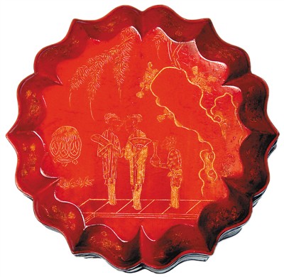 南宋朱漆戧金蓮瓣式人物花卉紋奩蓋面