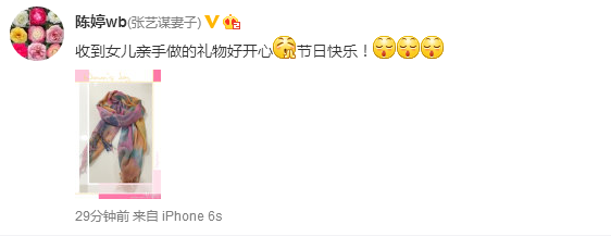 今日(3月8日),張藝謀的妻子陳婷在微博曬出一條漂亮絲巾,并附言稱:“收到女兒親手做的禮物好開心,節(jié)日快樂!”
