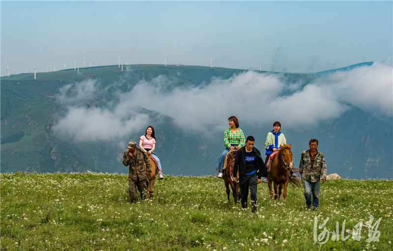2020年7月10日,淶源縣空中草原景區(qū),十八盤村村民為游客牽馬。河北日報記者 趙杰 攝
