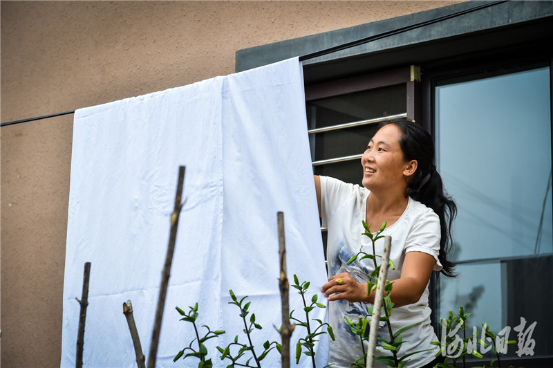 2020年7月10日,劉海林在自家的農(nóng)家院里晾曬床單,準備迎接周末的客人。河北日報記者 趙海江 攝