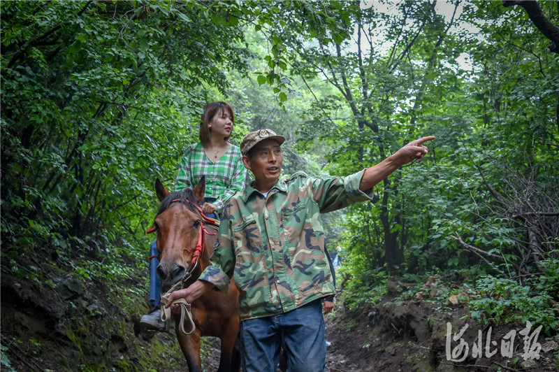 2020年7月10日,村民張小五一邊為游客牽馬,一邊講解十八盤村的由來。河北日報記者 趙海江 攝