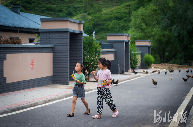 2020年7月10日,兩位小姑娘走過村中道路,漂亮的民居和潔凈的街道讓十八盤村煥然一新。