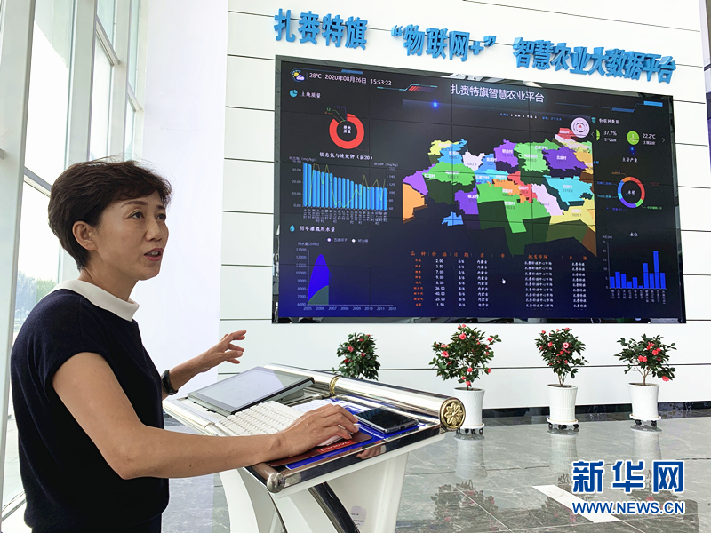 扎賚特旗現(xiàn)代農(nóng)業(yè)示范園區(qū)管理委員會主任許慧敏,在展示產(chǎn)業(yè)園里的“物聯(lián)網(wǎng)+”智慧農(nóng)業(yè)大數(shù)據(jù)平臺。記者王靖 攝