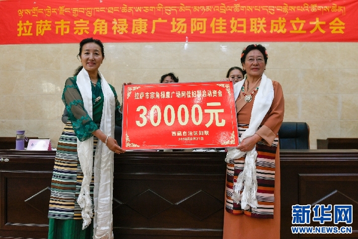 8月31日,拉薩市宗角祿康廣場阿佳婦聯(lián)代表展示西藏自治區(qū)婦聯(lián)撥發(fā)的啟動資金,以及拉薩市婦聯(lián)授予的牌匾。