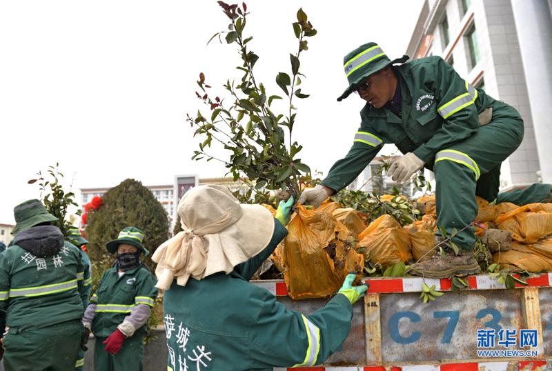 3月11日,拉薩市城關(guān)區(qū)潔達(dá)園林公司工人在搬運(yùn)紅葉石楠苗木。新華社記者劉東君 攝 -