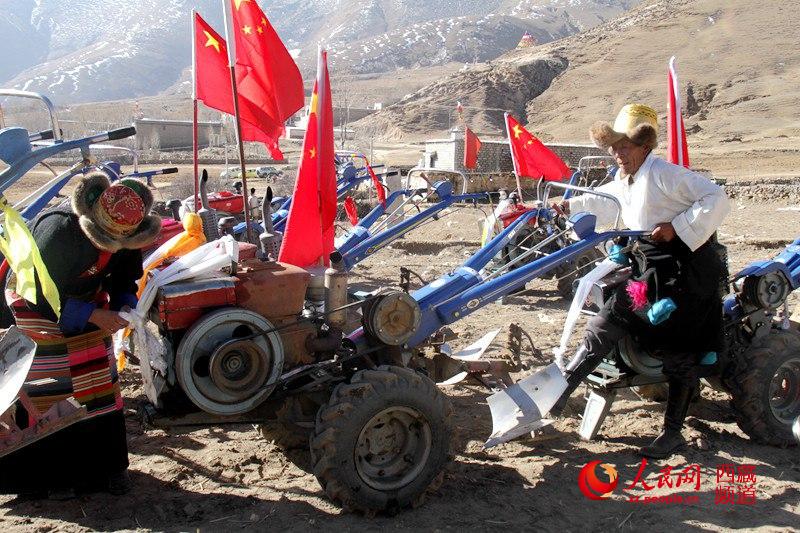 3月16日,西藏拉薩市娘熱鄉(xiāng)加爾西村舉行春耕春播。圖為村民在拖拉機(jī)掛上“吉祥哈達(dá)”。吳雨仁 攝