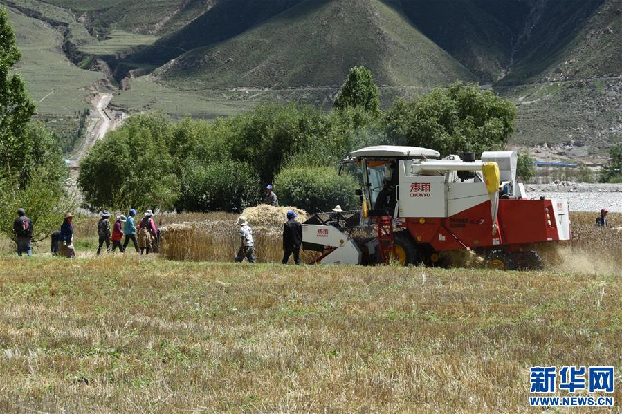 •      8月21日,聯(lián)合收割機(jī)在山南市桑日縣桑日鎮(zhèn)奴卡村的麥田里收割麥子 新華社記者 張京品 攝