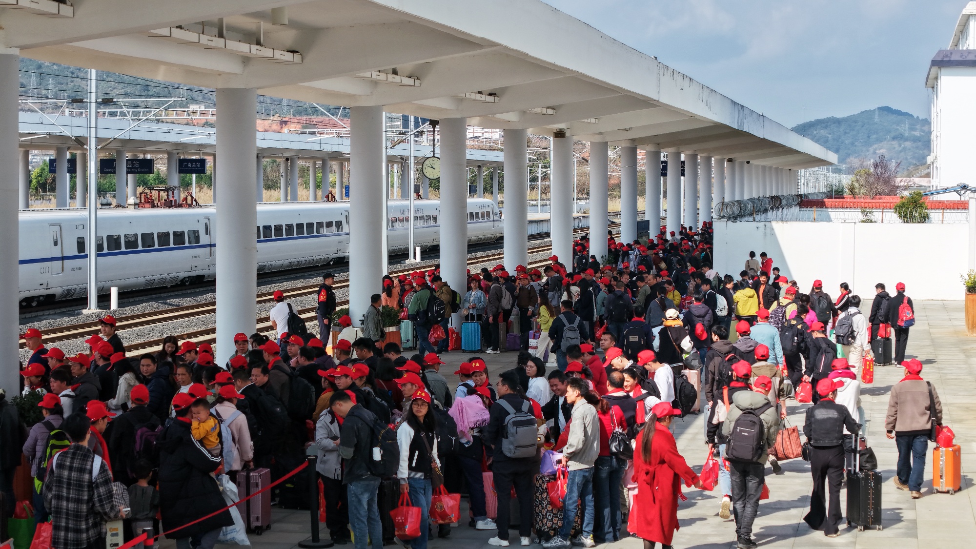 為保障農(nóng)村勞動(dòng)力順利返崗就業(yè),國鐵昆明局在云南省曲靖市、文山州廣南縣、普者黑、富寧等地同步開行多趟務(wù)工專列。