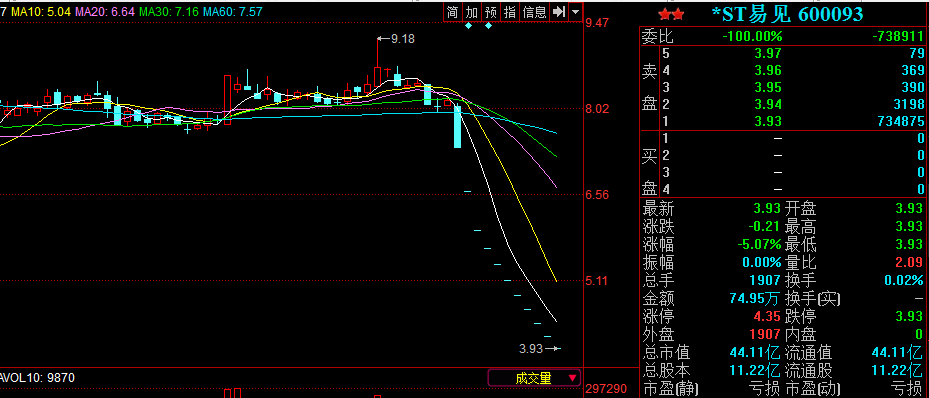 央廣網(wǎng)昆明7月17日消息(記者馬智波)7月16日,*ST易見(曾用名:易見股份)迎來復(fù)牌后第八個跌停,跌幅為5.07%。易見股份在4月30日停牌,停牌前連續(xù)三個交易日跌停,跌幅10%。從復(fù)牌前到現(xiàn)在,已經(jīng)連續(xù)11個跌停,以4月27日收盤價8.13計算,其股價跌幅已經(jīng)達到51.6%。