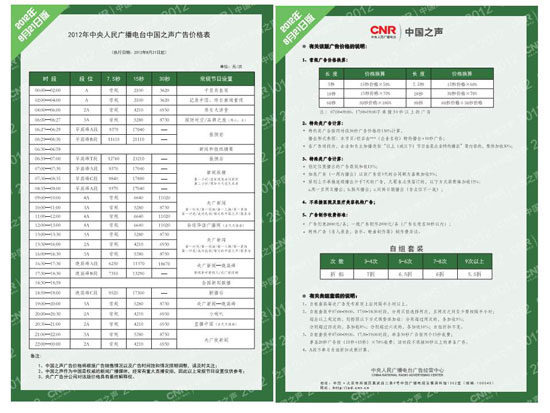 中央人民廣播電臺(tái)中國(guó)之聲、經(jīng)濟(jì)之聲廣告價(jià)格將于2012年8月21日起調(diào)整,調(diào)整后價(jià)格表已于日前正式發(fā)布。全權(quán)負(fù)責(zé)中國(guó)之聲、經(jīng)濟(jì)之聲廣告業(yè)務(wù)經(jīng)營(yíng)的央廣廣告公司授權(quán)本網(wǎng)站獨(dú)家刊載,未經(jīng)授權(quán)請(qǐng)勿擅自刊登或轉(zhuǎn)載,否則將追究相關(guān)法律責(zé)任。