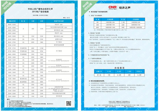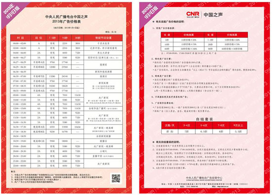 日前,2013年中央人民廣播電臺中國之聲、經(jīng)濟(jì)之聲廣告價(jià)格表正式發(fā)布,全權(quán)負(fù)責(zé)經(jīng)濟(jì)之聲廣告業(yè)務(wù)經(jīng)營的央廣廣告公司授權(quán)本網(wǎng)站獨(dú)家刊載,未經(jīng)授權(quán)請勿擅自轉(zhuǎn)載。