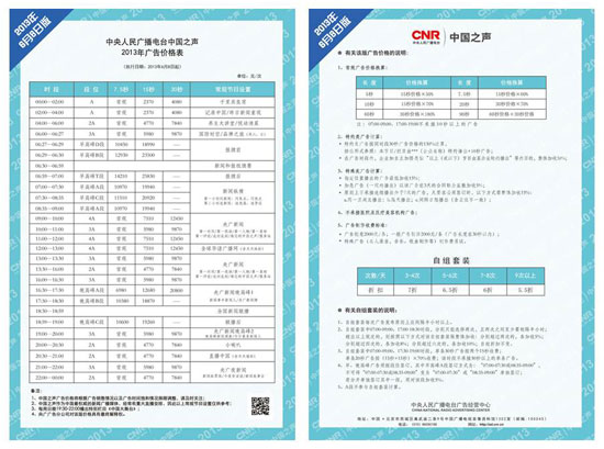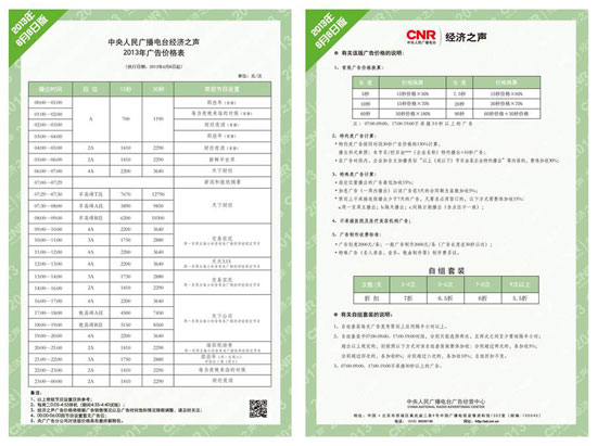 中央人民廣播電臺中國之聲、經(jīng)濟之聲廣告價格將于2013年6月8日起調(diào)整,調(diào)整后價格表已于日前正式發(fā)布。全權(quán)負責中國之聲、經(jīng)濟之聲廣告業(yè)務(wù)經(jīng)營的央廣廣告公司授權(quán)本網(wǎng)站獨家刊載,未經(jīng)授權(quán)請勿擅自刊登或轉(zhuǎn)載,否則將追究相關(guān)法律責任。