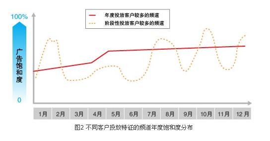 而對(duì)于年度投放合同較多的頻道,通常在年初廣告飽和度較低,進(jìn)入下半年或接近年底較高。一般年度性合同主要是在一月初到年底和四五月到年底兩種投放形態(tài)。對(duì)于年度性投放較集中的情況,則需在年初制定較低的價(jià)格,將飽和度充滿到55%以上。因?yàn)槿绻e(cuò)過一月開始的全年的投放,則意味著需要將廣告空置到三月底或更遠(yuǎn)的時(shí)間,即使從四月開始將未售出的時(shí)間銷售出90%,且價(jià)格再提升50%,也僅僅是與抵消了損失,并不可能產(chǎn)生收入增量。