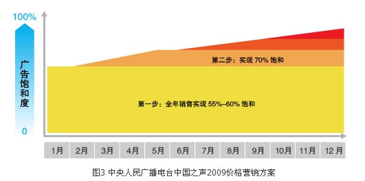 圖3顯示的是中央人民廣播電臺(tái)中國之聲2009年廣告年度價(jià)格營銷方案。該策略針對(duì)中國之聲以全年性投放客戶為主的特征,分為4個(gè)步驟操作: