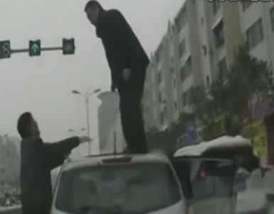 監(jiān)拍男子攔截轎車后爬上車頂蹦...