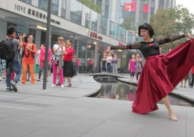 活動中,68歲的著名歌唱家程志帶領(lǐng)“月之上”老年合唱團(tuán)的老人們在現(xiàn)場的專業(yè)表演吸引了大家的圍觀。著名舞蹈家陳愛蓮帶領(lǐng)朝陽區(qū)三里屯社區(qū)舞蹈團(tuán)的50位老人跳著專門為此次快閃編排的舞蹈《小蘋果》將現(xiàn)場推向高潮。