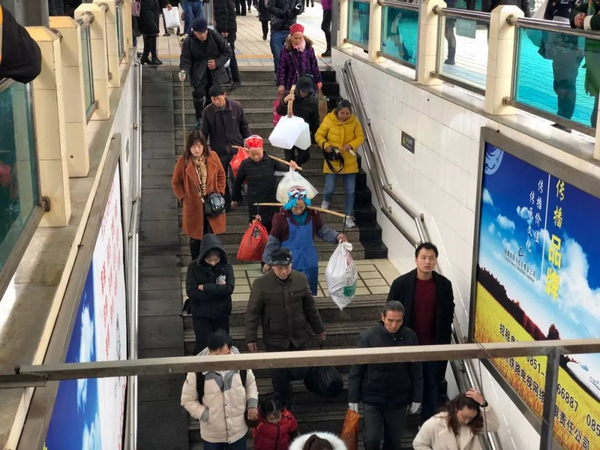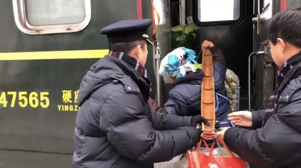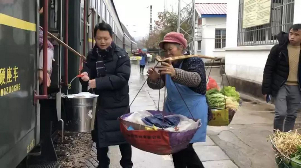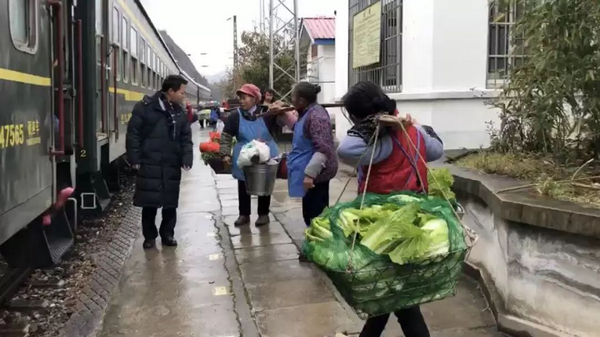 臨近年關(guān),剛下過(guò)一場(chǎng)冬雨,地面濕滑,仍有不少農(nóng)戶挑著自家的農(nóng)產(chǎn)品候車,他們大都要到凱里賣菜。為防止老人們摔倒,列車工作人員干脆擔(dān)當(dāng)起了“背簍工”。