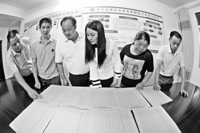 湖南省資興市是全國農(nóng)村集體產(chǎn)權(quán)制度改革試點(diǎn)縣市。新民農(nóng)村集體股份合作社成立于2015年2月,將資興市唐洞街道新民社區(qū)的農(nóng)村集體資產(chǎn)全部實(shí)行股權(quán)量化到人,以戶為單位登記并設(shè)立股權(quán)賬戶,發(fā)放股權(quán)證,2016年1月底實(shí)現(xiàn)第一次分紅。圖為9月28日,村民正在查看、核對(duì)股權(quán)分紅相關(guān)信息。朱孝榮鄧劍峰李鐵南攝