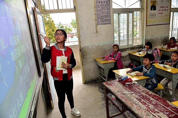 10月12日,“90后”特崗教師熊丹在給孩子們上語文課。