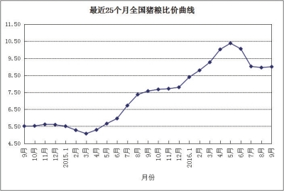 據(jù)對(duì)全國500個(gè)農(nóng)村集貿(mào)市場(chǎng)畜產(chǎn)品和飼料價(jià)格定點(diǎn)監(jiān)測(cè),2016年9月份,生豬產(chǎn)品、飼料產(chǎn)品、羊肉價(jià)格下跌,主要家禽產(chǎn)品、牛肉、生鮮乳價(jià)格上漲。按農(nóng)貿(mào)市場(chǎng)監(jiān)測(cè)口徑,本月豬糧比價(jià)為9.00:1,比上月上升0.05個(gè)點(diǎn)。