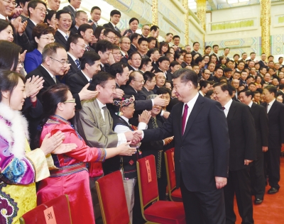 上午9時(shí)30分,習(xí)近平等來(lái)到人民大會(huì)堂金色大廳,同代表們親切握手,并合影留念。