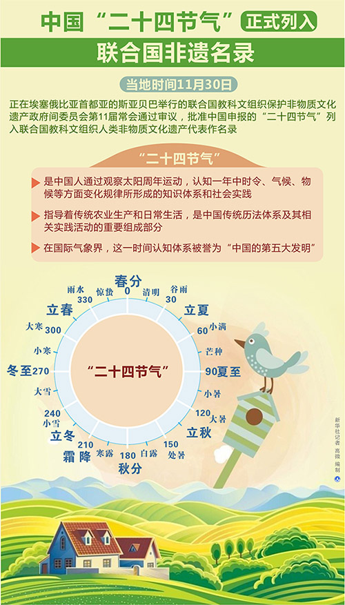 在埃塞俄比亞首都亞的斯亞貝巴舉行的聯(lián)合國教科文組織保護非物質(zhì)文化遺產(chǎn)政府間委員會第11屆常會11月30日通過審議,批準(zhǔn)中國申報的“二十四節(jié)氣”列入聯(lián)合國教科文組織人類非物質(zhì)文化遺產(chǎn)代表作名錄。