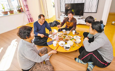 1月24日,吉林省和龍市南坪鎮(zhèn)高嶺村村民白羽榮(左二),正和家人在新房子里吃午飯。當(dāng)?shù)卣喾脚Πl(fā)展養(yǎng)殖業(yè)及木耳種植業(yè)等,同時還為140戶居民免費新建房屋,配合水、電和村路等設(shè)施改造,最終讓高嶺村在2016年摘掉了“貧困帽”。