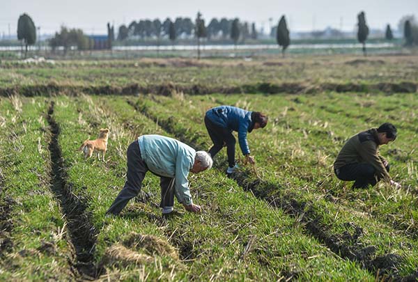 3月1日,織里鎮(zhèn)梅林港村農(nóng)民在稻田里除草、分揀麥苗。