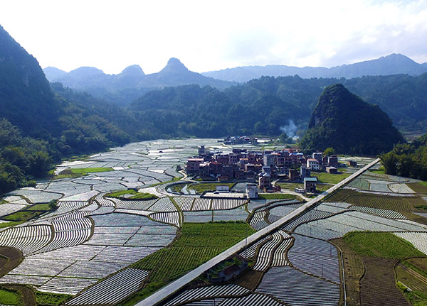 3月13日在廣西河池市羅城縣喬善鄉(xiāng)板團(tuán)村航拍的田園景色。