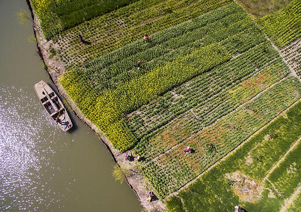 3月14日,江蘇省海安縣白甸鎮(zhèn)農(nóng)民在田間勞作(航拍照片)。