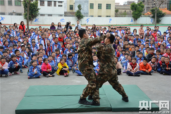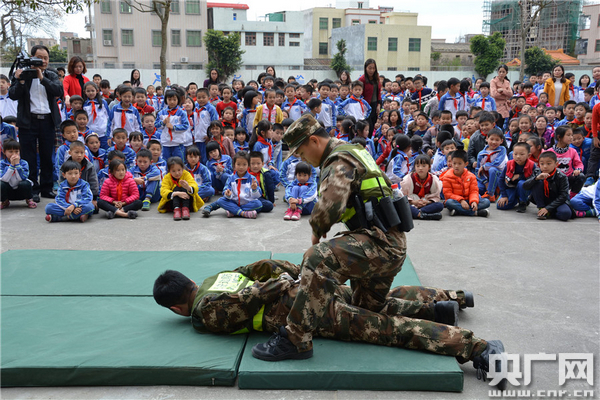 汕頭市云澳中心小學(xué)的學(xué)生們目不轉(zhuǎn)睛地看著汕頭邊防的武警學(xué)員演練抓捕術(shù)。辛雄發(fā) 攝