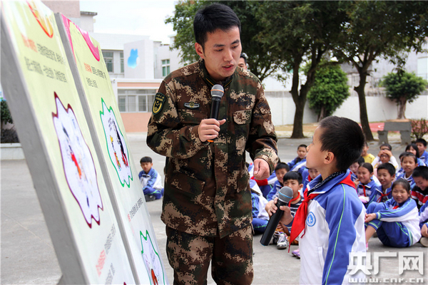 云澳邊防派出所學(xué)員林澤鵬在與向云澳中心小學(xué)學(xué)生講解安全知識(shí)。劉建高 攝