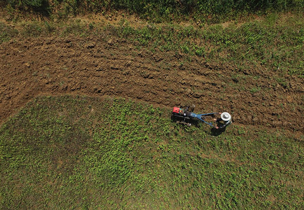 5月7日,在番陽六村憂遁草種植基地,一名村民操作機(jī)耕機(jī)翻整土地,為種植憂遁草做準(zhǔn)備。