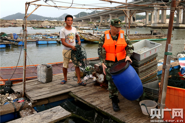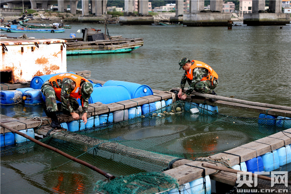 汕頭邊防支隊達濠邊防派出所官兵正在幫助漁民加固漁排。周峰 攝
