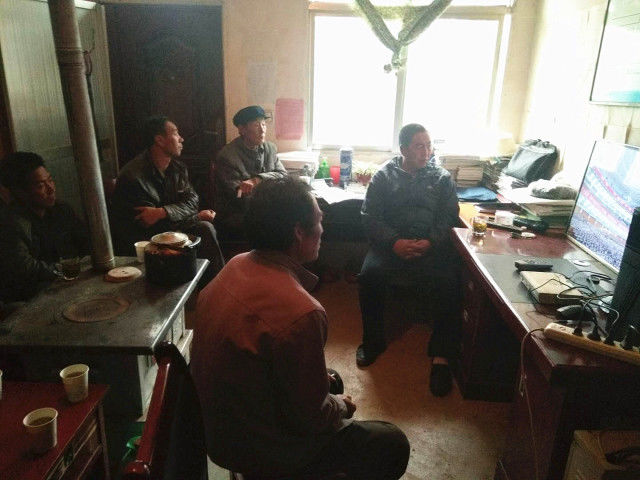 甘肅省臨洮縣康家集鄉(xiāng)大頭山村黨員們在屋里圍坐在一起觀看。(攝影:中國鄉(xiāng)村之聲農(nóng)民觀察員王富江)