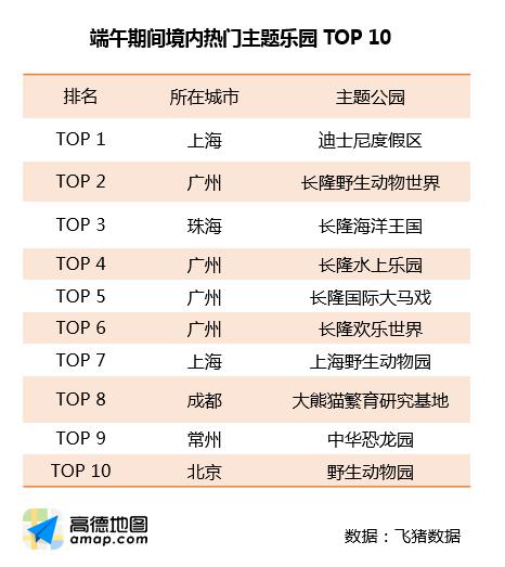 因端午假期正值父親節(jié),加之暑期來臨,主題樂園也成為家庭游玩的熱門場所。根據(jù)飛豬大數(shù)據(jù)統(tǒng)計,端午期間最受歡迎的主題樂園前三名分別為:上海迪士尼度假區(qū),廣州長隆野生動物世界,珠海長隆海洋王國。