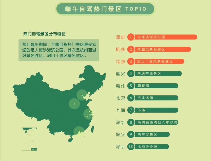自駕游依然是端午小長假群眾熱衷的出行方式。根據(jù)高德地圖旅游大數(shù)據(jù)預(yù)測,端午期間,全國自駕游最熱門的景區(qū)是大梅沙海濱公園,其次是杭州西湖風(fēng)景名勝區(qū)、房山十渡風(fēng)景名勝區(qū)。