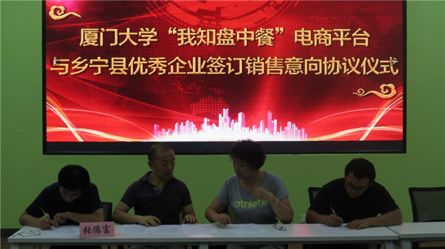 會(huì)議最后進(jìn)行了鄉(xiāng)寧各企業(yè)和“我知盤中餐”平臺(tái)的簽約儀式。張教授和廈門大學(xué)鄉(xiāng)寧實(shí)踐隊(duì)的努力以及“我知盤中餐”平臺(tái)所體現(xiàn)的“精準(zhǔn)扶貧”的理念讓各位企業(yè)代表與電商精英看到了美好的合作前景,一共有5家企業(yè)和電商與“我知盤中餐”平臺(tái)簽訂了合作協(xié)議。